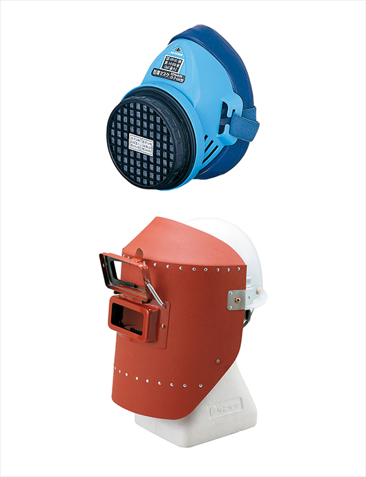 職場・工場内で使用する、消火器、防災用品、担架、検知器、身のまわりを守る、防じんマスク、保護メガネ、耳栓、防災面、溶接面、切創防止手袋